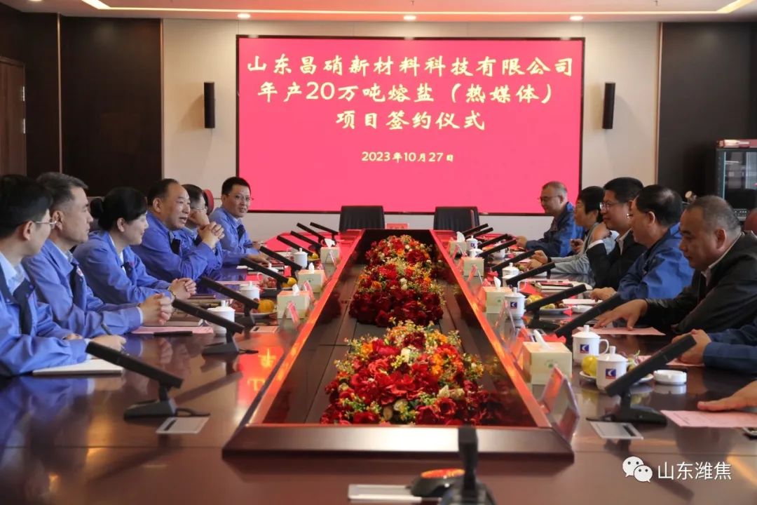 10月27日上午10:58分,山東昌硝新材料科技有限公司20萬噸/年熔鹽(熱媒體 )項(xiàng)目合作簽約儀式在集團(tuán)總部舉 行。濰坊昌盛硝鹽投資公司董事長(zhǎng)牟紅光、濰坊振興日升公司總經(jīng)理劉峰祥作為合作雙方代表進(jìn)行簽約。朱劉街道黨工委書 記董建濤、昌樂縣化工產(chǎn)業(yè)發(fā)展服務(wù)中 心主任王俊鳳,集團(tuán)董事長(zhǎng)劉良玉、副總經(jīng)理呂紅,濰坊昌盛硝鹽投資控股公司負(fù)責(zé)人牟邦志等出席簽約儀式。簽約儀式由集團(tuán)公司總經(jīng)理王讀福主持。