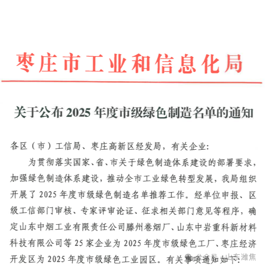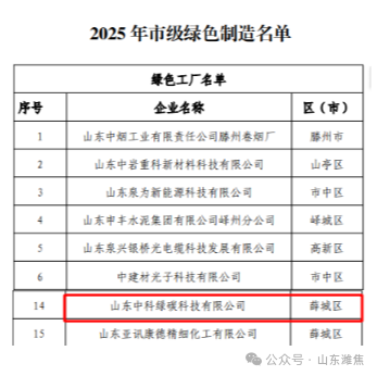 山東中科綠碳公司入選2025年棗莊市級綠色制造企業(yè)榜單